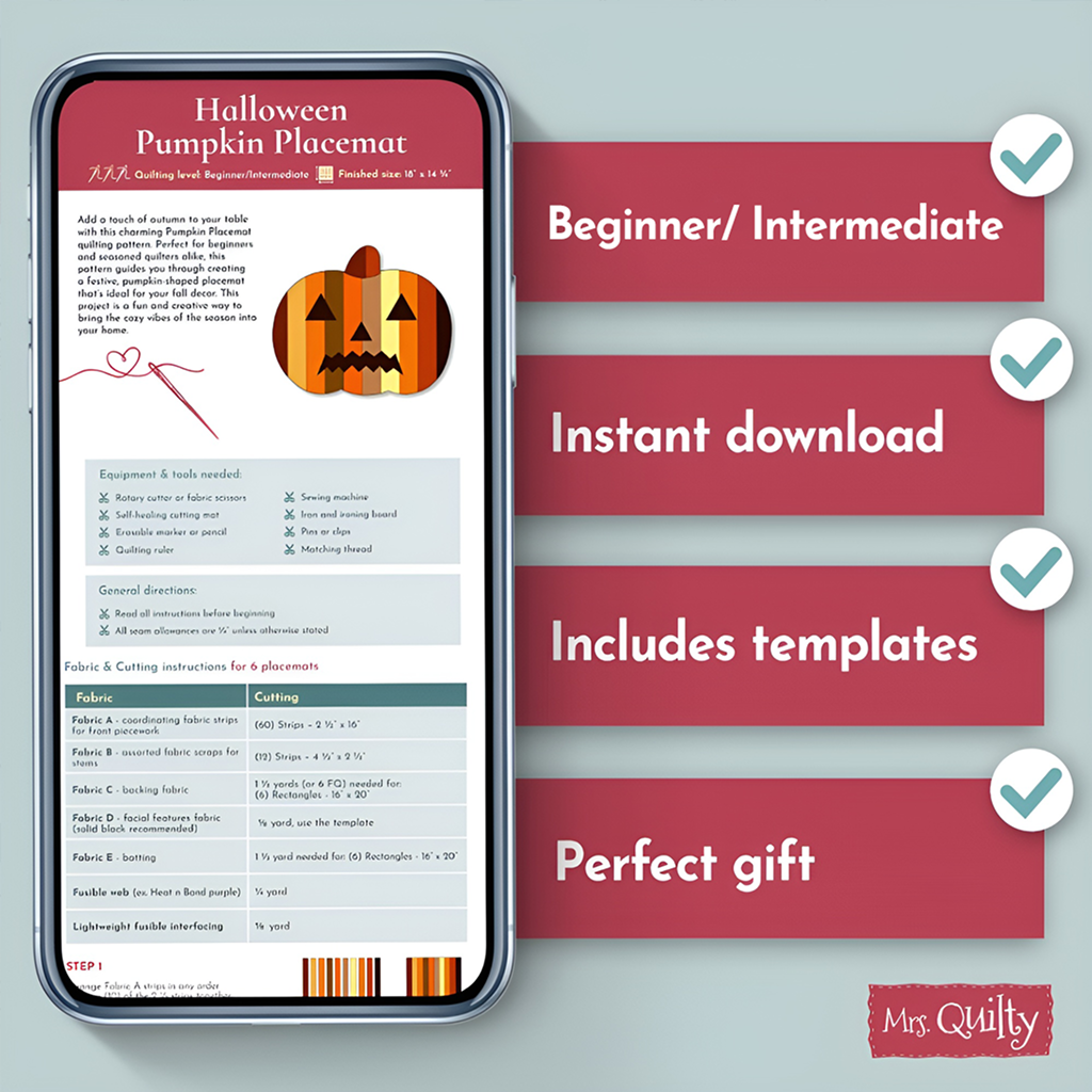 Add a touch of autumn to your table with this charming Halloween Pumpkin Placemat quilt pattern. Perfect for beginner to intermediate quilters, this project features a festive pumpkin design that’s sure to bring the cozy vibes of the season into your home.