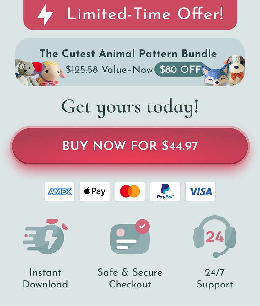 Once you’ve purchased the plushie bundle, your digital pattern will be available for immediate download! Simply check your email or account page for the link to access and download your pattern in PDF format. You can start crafting right away!