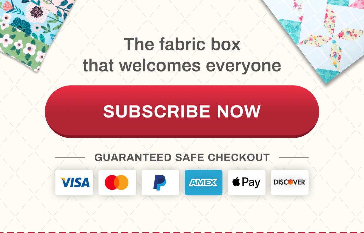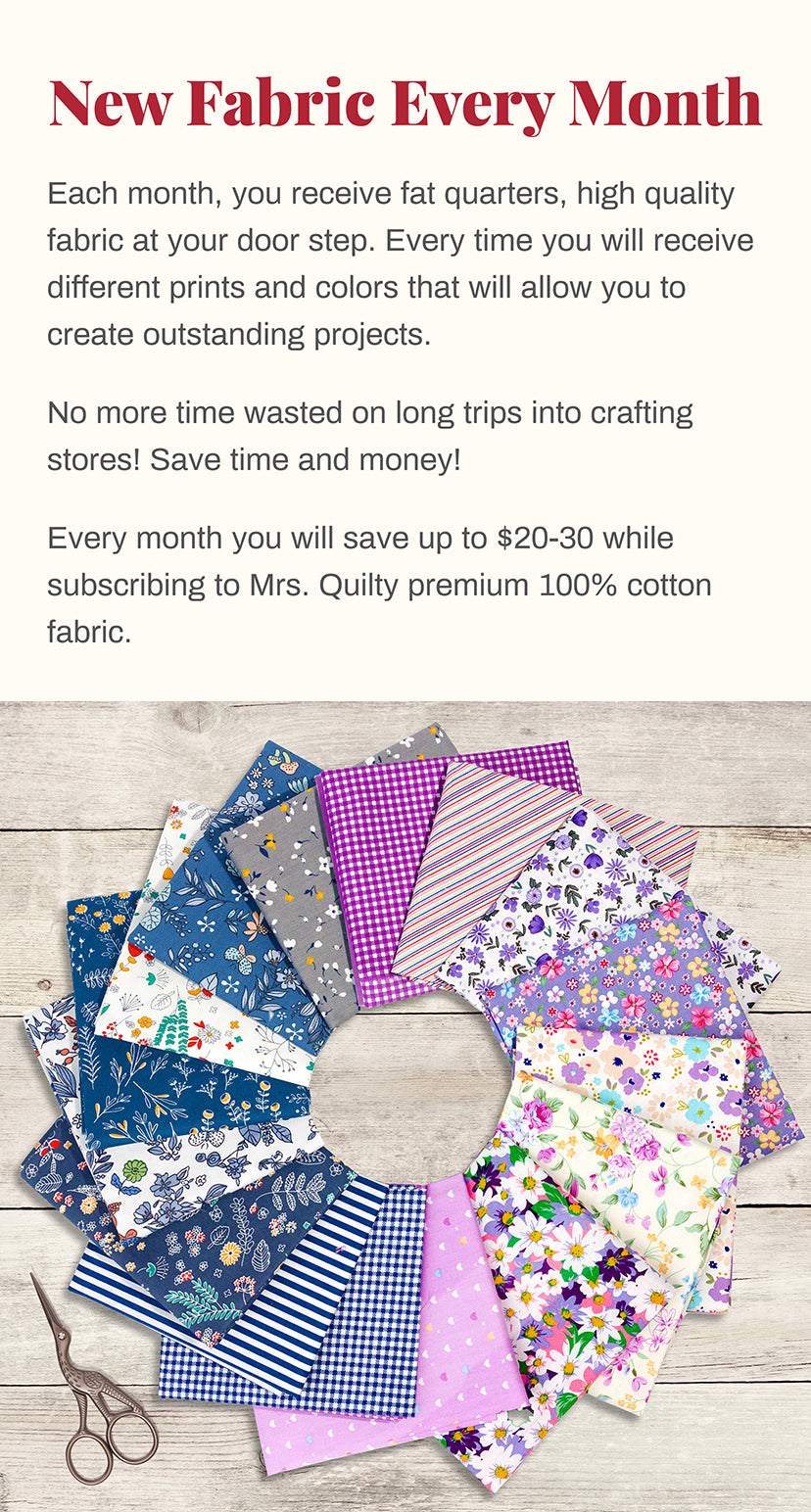 After you subscribe, a box filled with quilting fabrics and tools is sent to you each month with no repeating items!