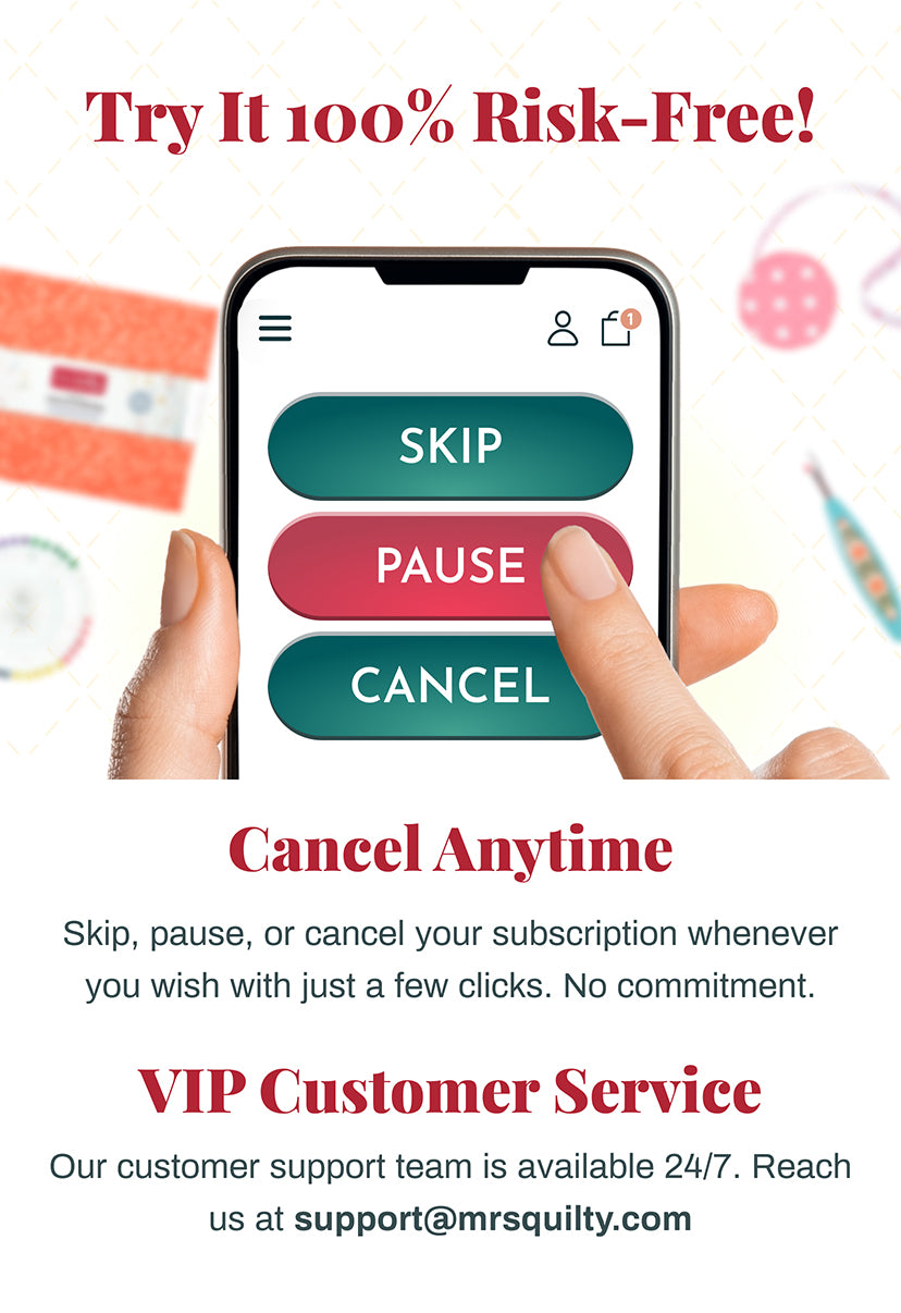The subscription operates on a monthly billing cycle, but you can adjust the frequency or cancel at any time without strings attached.Mrs. Quilty Box makes quilting fun and easy with a monthly delivery of special projects and top-quality cotton fabrics โ twice as much as rival boxes at a much lower price!