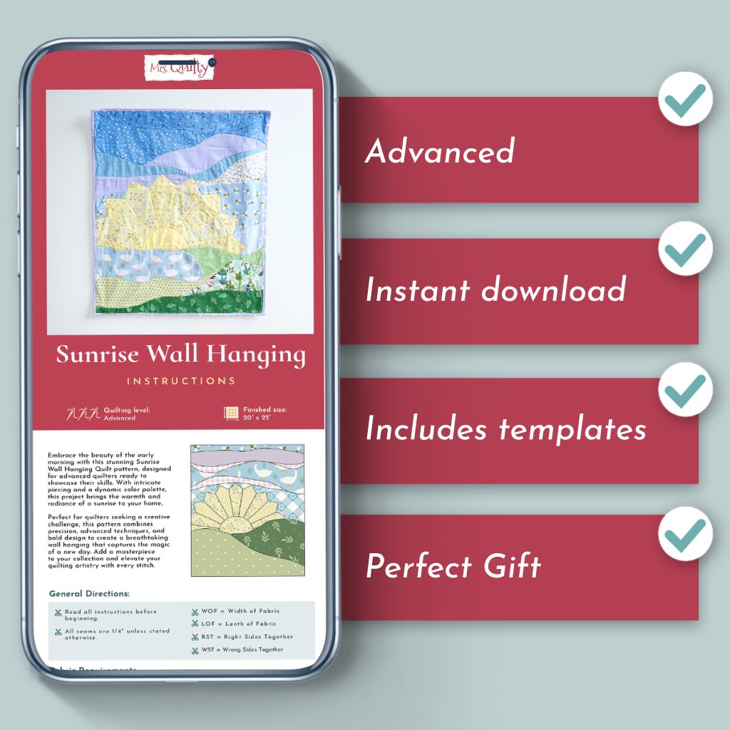 The Sunrise Wall Hanging pattern captures the peaceful magic of a new day. With soft curves, layered fabrics, and a glowing sunburst, this quilted wall hanging brings calm and color to any room. Whether you’re refreshing your sewing space or brightening up a hallway, this project adds handmade joy with every stitch.